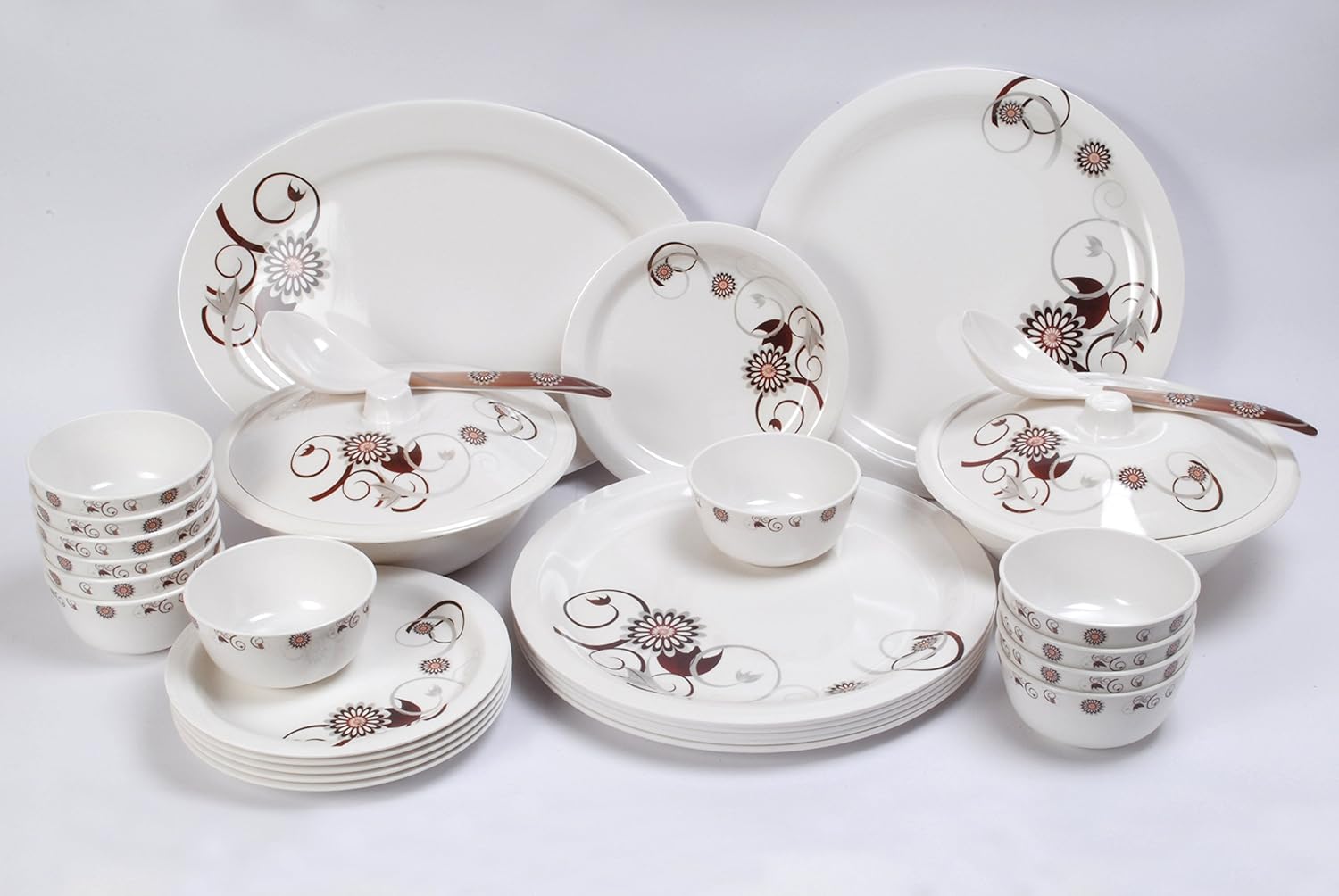 Dinner Set Contents 33 Pcs : Dinner Plate 10.5 " - 6 Pcs / Small Plate 7.5" - 6 Pcs / Curry Bowl 4.5" - 12 Pcs /All Purpose Bowl 7.0" - 1 Pcs / Donga Cover - 2 Pcs / Donga Base - 2 Pcs / Service Spoon - 3 Pcs / Rice Plate - 1 Pcs