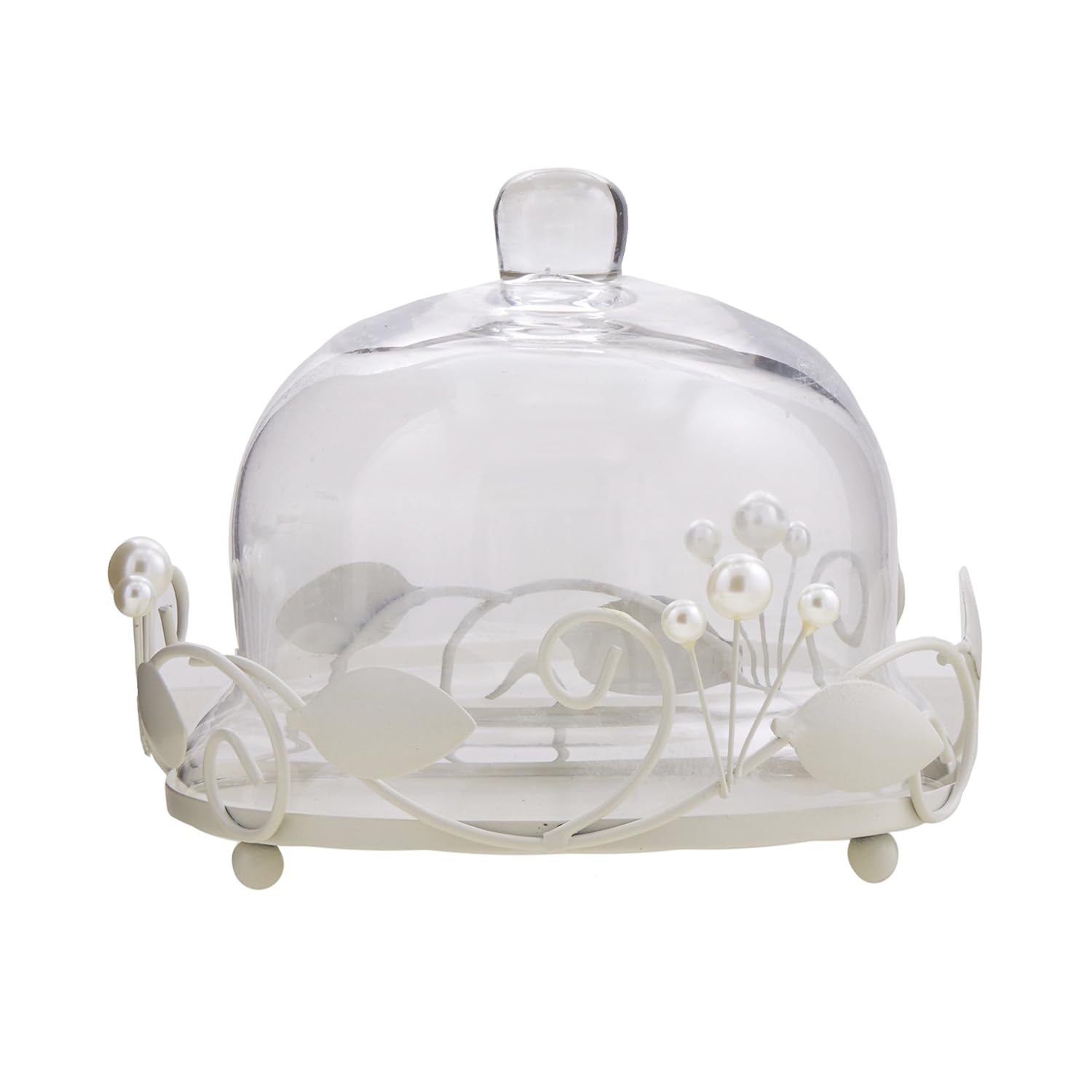 Ez Life Medium Cake/Pastry/Dessert Stand With White Pearls & Glass Dome Set