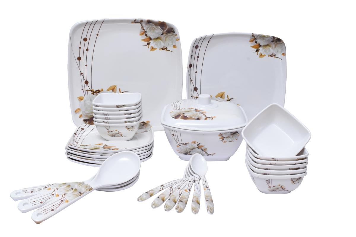 Flowerware Melamine Dinner Set of of 40 pieces, square shaped, standard size, unbreakable with everlasting shiny print