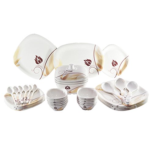 1. Material used- melamine 2.Break resistant 3.Dishwasher safe, 4 Stackable 5.Hygienic 6. Design and color will never faint this dinner set makes it easier to serve at least 12 persons at a time. Consist of - 6 full plates, 6 half plates, 12 bowls, 3 donga, 3 donga lid, 3 serving spoon, 1 rice plate ALL ITEMS ARE OF STANDARD SIZE #PERFECT FOR GIFT PURPOSE Beautiful and attractive packing of our dinner set makes it perfect to give it as gift to your friend and love ones.