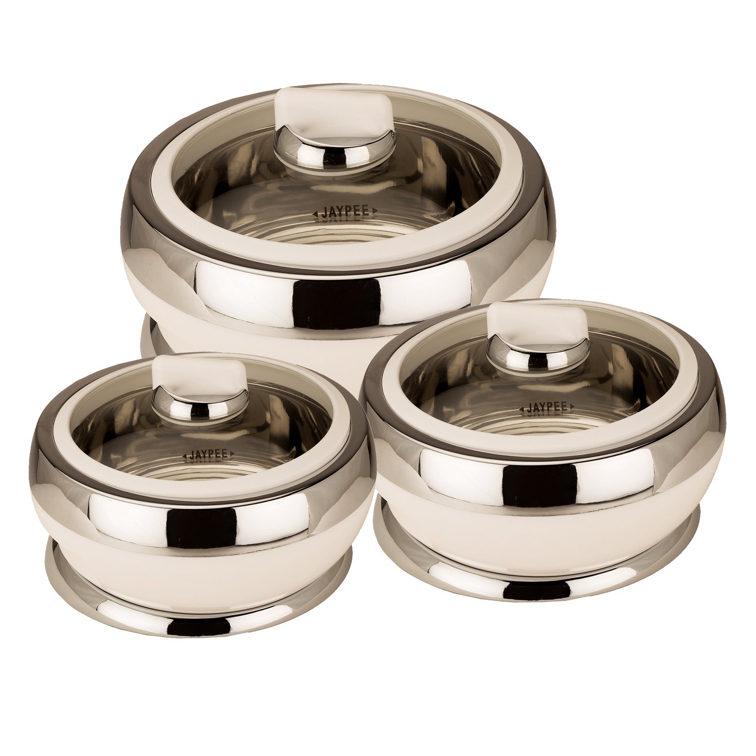 Super fine glossy chrome finish and knob design makes this set of three casseroles the pride of your dining table and is also good for gifting purpose
