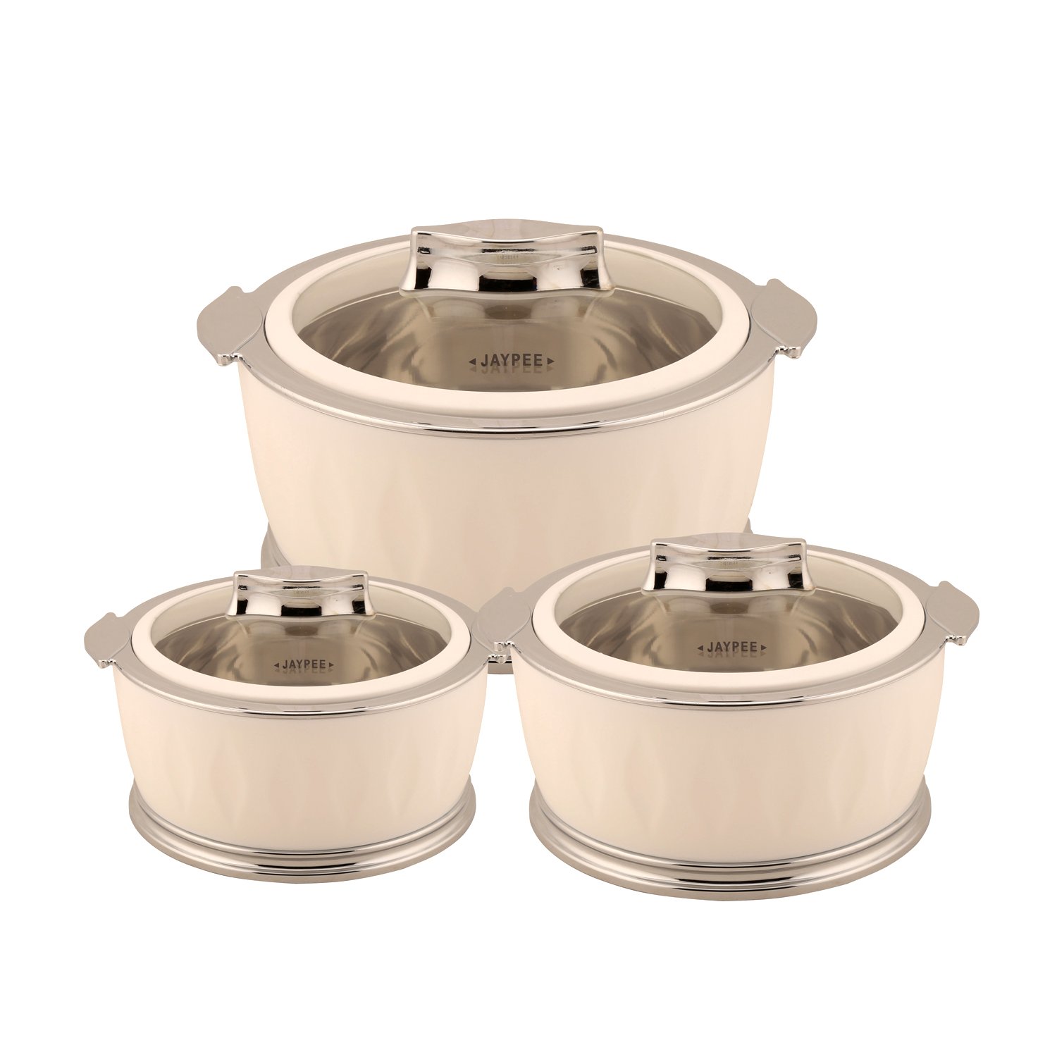 Chrome finished rim and base along with knob and handles make this set of three casseroles beautiful and enhances your serving experience It's also good for gifting purpose