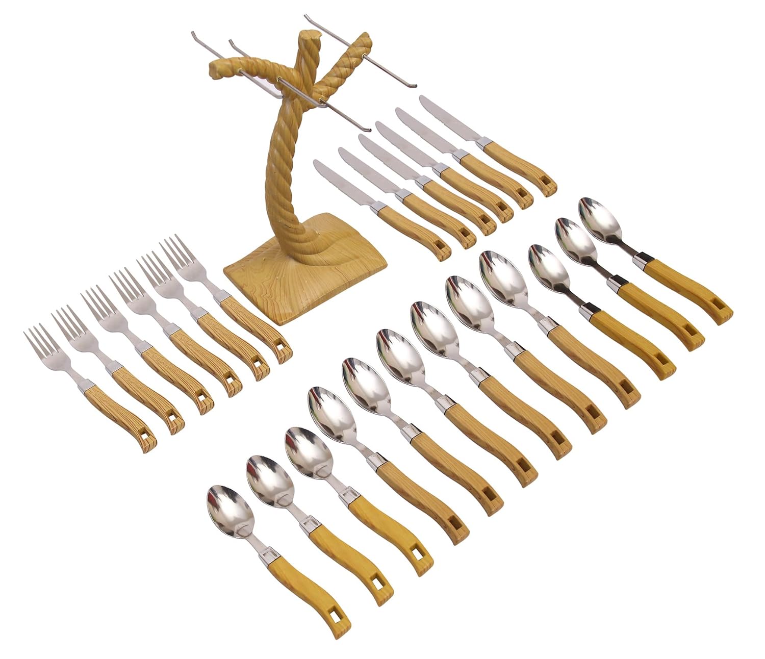 Livzing 24pcs Cutlery Set Spoon Fork Knife wooden handle Stand For Kitchen And Dining Table