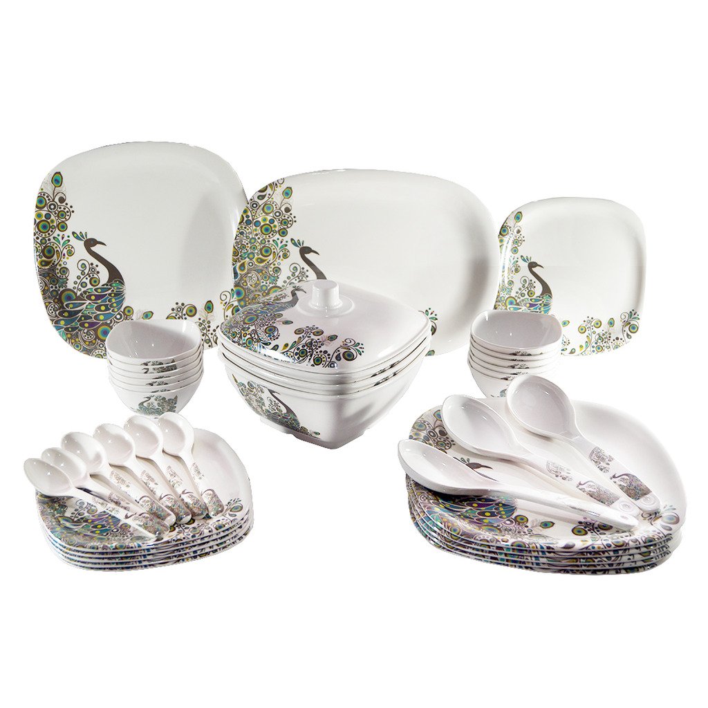 This stylish dinner set is decorated with beautiful art work from our exclusive and wide range of design portfolio which is constantly escalating in line with new trends- colors, shapes, use etc. -our designers and engineers create modern, functional, original items for you. 1. Material used- melamine 2.Break resistant 3.Dishwasher safe, 4 Stackable 5.Hygienic 6. Design and color will never faint this dinner set makes it easier to serve at least 12 persons at a time. Consist of - 6 full plates, 6 half plates, 12 bowls, 3 donga, 3 donga lid, 3 serving spoon, 1 rice plate ALL ITEMS ARE OF STANDARD SIZE #PERFECT FOR GIFT PURPOSE Beautiful and attractive packing of our dinner set makes it perfect to give it as gift to your friend and love ones. If you cook so good so why not to serve your dishes in a hygienic admirable utensils.