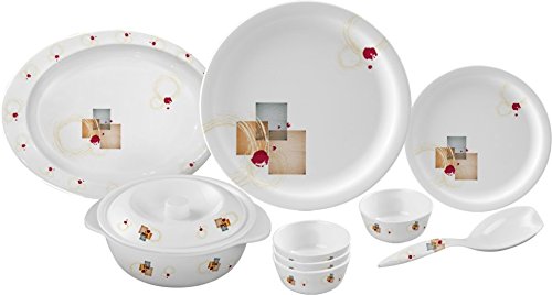 Package Contents: 6-Pieces Dinner Plate (28cm) , 6-Pieces Side Plate (19cm), 6-Pieces Veg Bowl (10.5cm), 6-Pieces Katori (9.5cm), 2-Pieces Serving Casserole (19cm) with Lid, 2-Pieces Trendy Serving Spoon (24cm), 1-Piece Serving Platter (2.5cm) and 2-Pieces Lid