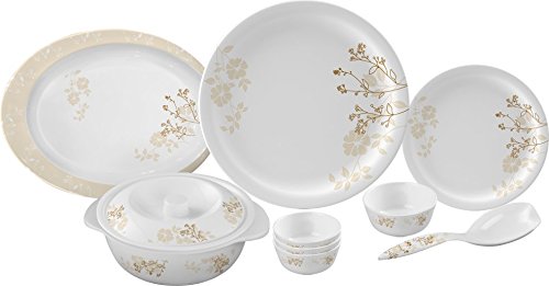 Package Contents: 6-Pieces Dinner Plate (28cm) , 6-Pieces Side Plate (19cm), 6-Pieces Veg Bowl (10.5cm), 6-Pieces Katori (9.5cm), 2-Pieces Serving Casserole (19cm) with Lid, 2-Pieces Trendy Serving Spoon (24cm), 1-Piece Serving Platter (2.5cm) and 2-Pieces Lid.