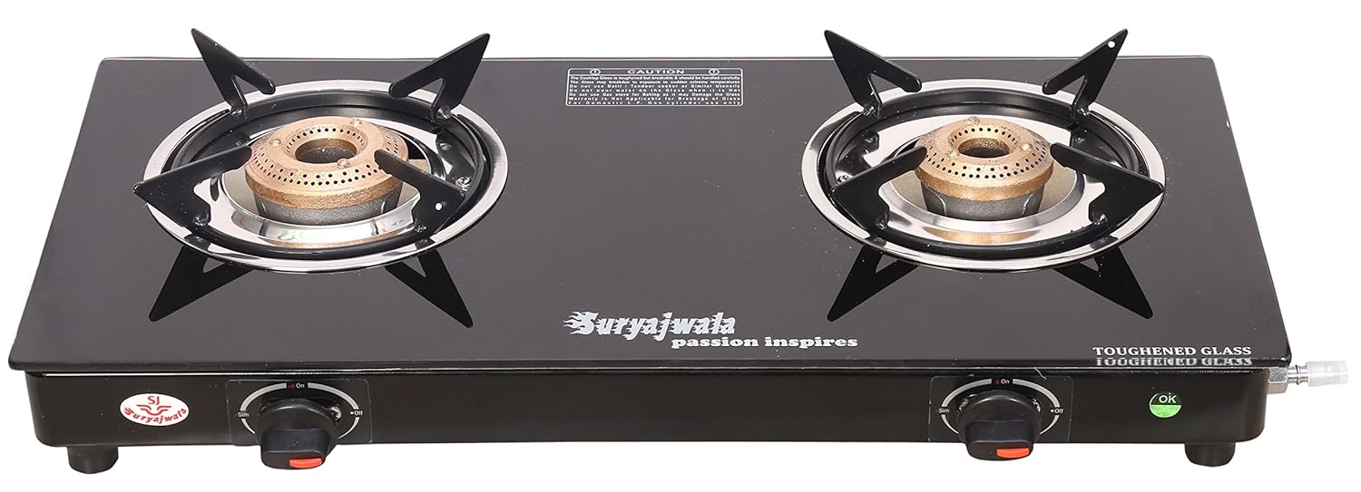 Suryajwala Royal CI Glass 2 Burner Manual Gas Stove, Black
