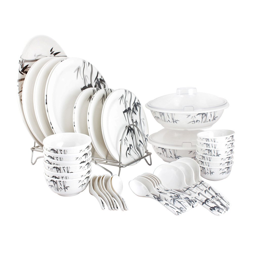 WHITE GOLD 44 PCS MELAMINE FULL DINNER SET CROCKERY - ROUND - BAMBOO